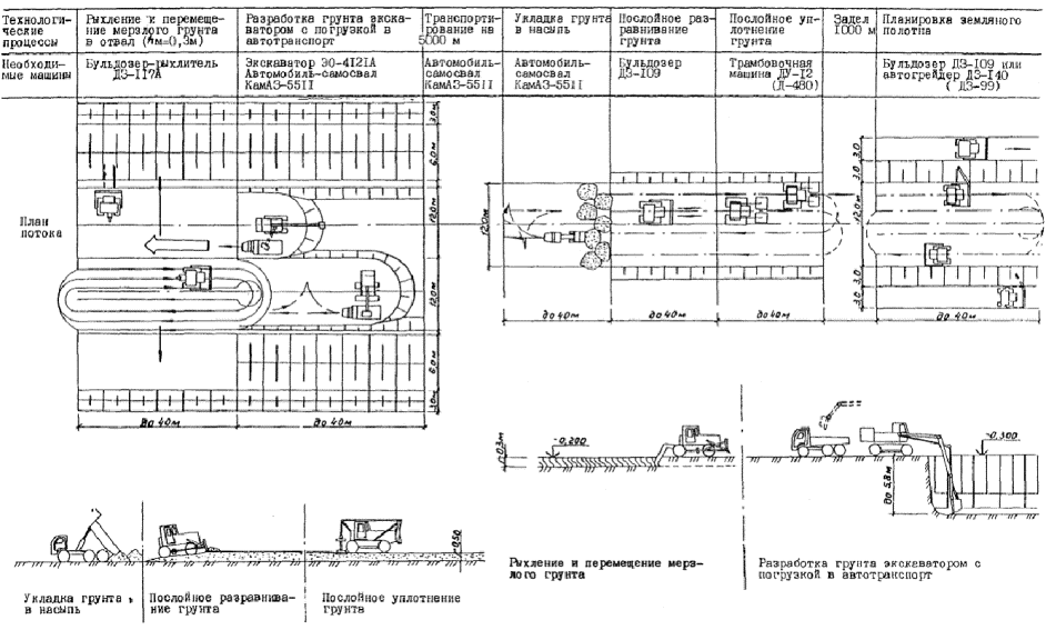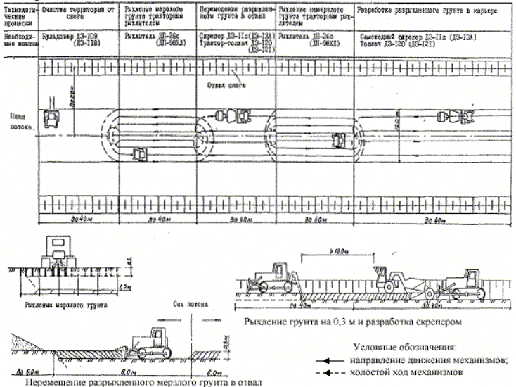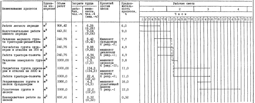 МОСКВА 1989 1. ОБЛАСТЬ ПРИМЕНЕНИЯ1.1. Типовая технологическая карта (ТТК) разработана для применения при проектировании организации и производства земляных работ в зимних условиях в районах, относящихся к пятой температурной зоне, в грунтах IIIм группы со скальными включениями. ТТК комплексно-механизированного технологического процесса устройства земляного полотна автомобильных дорог разработана для насыпи высотой до 3,0 м. 1.2. В качестве грунтов дорожной насыпи приняты тяжелые суглинки с примесью щебня до 40 %. Глубина сезонного промерзания грунта в конце второй трети зимнего периода составляет 1,0 м. Грунтовые воды встречаются на отметке ниже 5,0 м. 1.3. Производство работ предусмотрено в три смены, исходя из условия предохранения грунта от смерзания во время перерывов между сменами. 1.4. В составе ТТК приведены три варианта комплексно-механизированного технологического процесса разработки грунта, транспортирования и возведения насыпи до проектной отметки. В вариантах комплексов механизмов сравниваются ведущие машины. Машины, занятые на подготовительных работах, приняты общими для всех вариантов. 1.5. Привязка ТТК к конкретным объектам и условиям производства работ заключается в уточнении объемов работ, калькуляций затрат труда, машинного времени и заработной платы, графиков производства работ и технико-экономические показатели на измеритель конечной продукции. 2. ОРГАНИЗАЦИЯ И ТЕХНОЛОГИЯ ВЫПОЛНЕНИЯ РАБОТ2.1. Работам по устройству земляного полотна предшествуют подготовительные мероприятия. До наступления постоянных отрицательных температур выполняют работы по геодезической разбивке и закреплению карьера (резервов) и трассы автодороги, срезке растительного слоя грунта, рыхлению грунта на глубину до 0,3 м и боронованию. Подготовительные работы, которые ведутся непосредственно перед разработкой грунта в карьере или боковых резервах и на трассе автодороги, выполняют в зимний период. Они состоят из наталкивания снега и устройства снегозадерживающих валов, расчистки захватки от снега, разбивки элементов карьера и трассы, устройства землевозных дорог и ухода за ними. 2.2. Комплексно-механизированных технологический процесс предусматривает предварительное рыхление грунта тракторным рыхлителем. Разработку и транспортирование грунта осуществляют скреперами. Как вариант рассмотрена разработка грунта в карьере экскаватором с транспортированием в насыпь автомобилями-самосвалами. 2.3. На участке производства работ организуются склады ГСМ, инвентаря и запасных частей, вагончик производителя работ, помещение для отдыха рабочих, приема пищи и обогрева. Участок должен быть обеспечен медицинской аптечкой, питьевой и хозяйственной водой. В темное время суток участки производства работ должны освещаться прожекторами, установленными на инвентарные передвижные мачты или вышки. 2.4. Схемы производства работ по разработке грунта, транспортированию и укладке в насыпь земляного полотна автодороги приведены на листах 3 и 4. 2.5. Растительный грунт снимают со всей площади, отведенной под карьер и трассу автодороги, в летний период. Лишний грунт, не используемый для укрепления откосов, употребляют для повышения продуктивности сельскохозяйственных полей. Границы в плане, толщина снимаемого слоя, места и дальность транспортирования пло