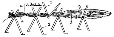 Рис. 12. Вязка хворостяного каната: 1 - сжим; 2 - хворост; 3 - козлы; 4 - канат; 5 - перевязка