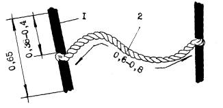 Рис. 13. Веревочный сжим: 1 - палка; 2 - веревка Состав работы 1. Подноска перевязок на расстояние до 10 м. 2. Укладка хвороста на готовые козлы. 3. Стягивание сжимом уложенного на козлах хвороста. 4. Связывание перевязками сжатого сжимами каната. 5. Распаривание виц (при перевязке вицами). 6. Относка готового каната в штабель на расстояние до 10 м. Состав звена Речной рабочий 2 разр. - 1 Подсобный (транспортный) рабочий 1 разр. - 1 Нормы времени на 100 м каната