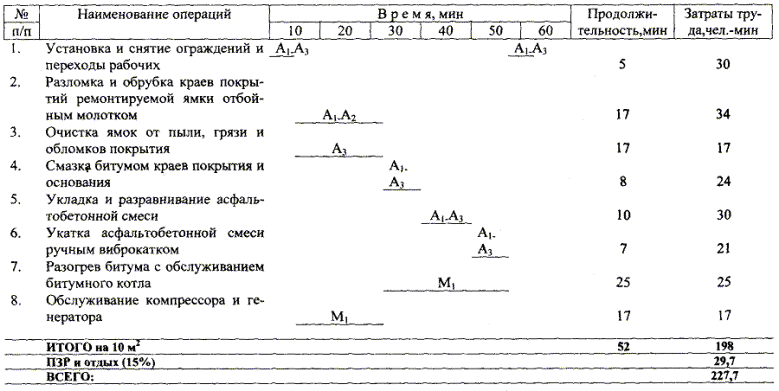 3.3. Спецодежда и спецобувь. 1. Полукомбинезон хлопчатобумажный 4 2. Ботинки кожаные 4 пары 3. Рукавицы брезентовые 3 пары 4. Рукавицы комбинированные 1 пара 5. Наколенники брезентовые 3 пары 6. Жилет сигнальный 3 шт. 3.4. Потребность в материалах на 10 м2 ремонтируемой площади при глубине выбоин до 50 мм: смесь асфальтобетонная горячая мелкозернистая (ГОСТ 9128-84) - 1,19 т; битум жидкий - 5 л; топливо дизельное. 4. Технология процессов и организация труда4.1. Работы по ямочному ремонту асфальтобетонных покрытий с применением машин ЭД-105 для ремонта асфальтобетонных покрытий проводятся в следующей технологической последовательности: - установка и снятие ограждений и переходы рабочих на расстояние до 50 м; - разломка и обрубка краев покрытия ремонтируемой ямки отбойным молотком; - очистка ямок от пыли, грязи и обломков покрытия; - смазка битумом краев покрытия и основания; - укладка и разравнивание асфальтобетонной смеси; - укатка смеси вибрационным ручным катком; - разогрев битума с обслуживанием битумного котла; - обслуживание компрессора и генератора. 4.2. График трудового процесса (график трудового процесса составлен на ямочный ремонт покрытия площадью 10 м2)