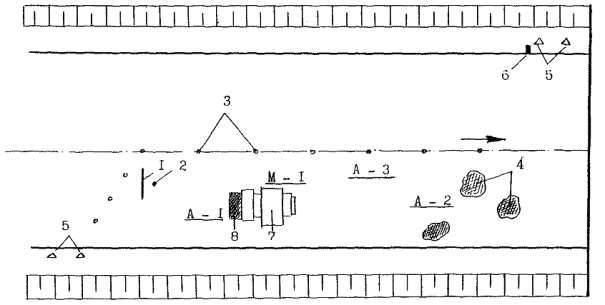 М1, А1, А2, А3 - места нахождения рабочих; 1 - инвентарный барьер; 2 - дорожный знак; 3- конусы направляющие; 4 - выбоины на покрытии; 5 - дорожный знак; 6 - дорожный знак; 7 - машина для ремонта черных покрытий; 8 - карта-вырубка, заполненная асфальтобетонной смесью. Стрелкой указано направление движения звена. Схема расстановки дорожных знаков при ремонтных работах (объезд по проезжей части).