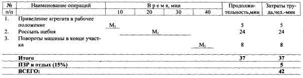3.3. Спецодежда и спецобувь. 1. Комбинезон хлопчатобумажный 1 2. Рукавицы комбинированные двупалые 1 пара 3.4. Расход щебня фракции 10 - 20 мм - 1,3 - 1,4 м3 на 100 м2 покрытия; битумная эмульсия - 1,3 л/м2. 4. Технология и организация процесса4.1. Технологический процесс по россыпи щебня при поверхностной обработке асфальтобетонного покрытия комбинированной дорожной машины КДМ-130 включает следующие операции: - приведение агрегата в рабочее положение; - россыпь щебня; - повороты машины в конце участка. 4.2. График трудового процесса