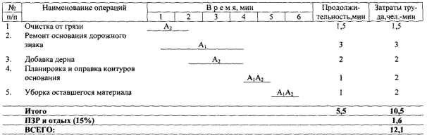 Примечание: В затраты труда по карте включено время на подготовительно заключительные работы - 5 % и отдых - 10 %. Использование приемов и методов труда, рекомендуемых картой, позволит снизить затраты труда и повысить выработку на 5 %. В нормах не предусмотрена заготовка дерна и переходы от одного дорожного знака к другому. 2. Подготовка и условия выполнения процесса2.1. Ремонт оснований дорожных знаков осуществляется в сухое и теплое время года. 2.2. До начала производства работ необходимо выявить дорожные знаки, где необходимо ремонтировать основание. 2.3. К месту производства работ необходимо доставить заранее приготовленный дерн. 2.4. К работе допускаются рабочие, прошедшие инструктаж по технике безопасности с учетом специфики работ по данному трудовому процессу. 2.5. Рабочие должны быть одеты в сигнальные жилеты и соблюдать требования безопасности труда. 3. Исполнители, предметы и орудия труда3.1. Исполнители. 1. Дорожный рабочий 2 разряд (А1) 1 2. Дорожный рабочий 1 разряд (А2) 1 3.2. Машины, оборудование, инструменты, приспособления, инвентарь