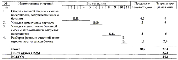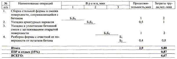 1. Вибратор 1 2. Ключ гаечный разводной 2 3. Стальная опалубка (для столбиков 5 кассет; столбов - 8 кассет) 1 4. Монтировка 2 5. Мастерок (скребок) 2 6. Лопата 1 7. Щетки металлические 2 8. Кисть фибровая 1 9. Ведро для эмульсии 1 10. Штырь 1 3.3. Спецодежда и спецобувь. 1. Комбинезон хлопчатобумажный 2 2. Ботинки кожаные 2 пары 3. Рукавицы комбинированные 2 пары 4. Защитные очки 2 3.4. Норма расхода материалов: расход бетона (М-300) на одно изделие 0,06 м3, арматура - 2,28 кг. 4. Технология и организация процесса4.1. Приготовление железобетонных сигнальных столбиков и столбов в стальной форме ведется в следующей технологической последовательности: - сборка стальной формы и смазка поверхности, соприкасающейся с бетоном; - укладка арматурных каркасов в форму; - укладка и уплотнение бетонной смеси с заглаживанием открытой поверхности; - разборка формы с очисткой ее поверхности от остатков бетона. 4.2. График трудового процесса а. для сигнальных столбиков