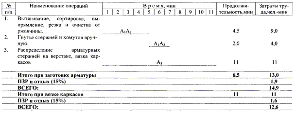 Примечание: В затраты труда по карте включено время на подготовительно заключительные работы - 5 % и отдых - 10 %. Снижение затрат труда и повышение выработки на 7-9 % достигается в результате использования методов и приемов труда, рекомендуемых в карте. 2. Подготовка и условия выполнения процесса2.1. Работы по заготовке арматуры выполняются на открытом воздухе, гнутье арматуры и вязка каркаса выполняется в летнее время под навесом, а в зимнее - в помещении. 2.2. Каркас изготовляется из 4-х стержней несущей арматуры ст А-1 Ø 8 мм, объединенных в каркас с помощью стержня длиной 9240 мм, изогнутого змейкой. 2.3. Заготовка арматуры производится из стали, поставляемой в бухтах, с размоткой бухт ручной лебедкой. Гнутье арматуры Ø 3 мм производится на ручном станке с помощью специального приспособления-шаблона. 2.4. Рабочие должны быть одеты в спецодежду и снабжены рукавицами. 2.5. К работе допускаются рабочие, прошедшие инструктаж по технике безопасности с учетом специфики работ по данному трудовому процессу. 3. Исполнители, предметы и орудия труда3.1. Исполнители. При заготовке арматуры: 1. Арматурщик 3 разряд (А1) 1 2. Арматурщик 2 разряд (А2) 1 При вязке арматурных каркасов: 3. Арматурщик 3 разряд (А3) 1 3.2. Машины, оборудование, инструменты, приспособления, инвентарь.