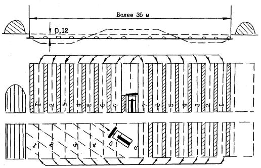 Примечание: В затраты труда по карте включено время на подготовительно-заключительные работы - 5 % и отдых - 10 %. Снижение затрат труда и повышение выработки на 4,5 % достигается в результате совмещения рабочих операций машинистом бульдозера и применения продольно-поперечной схемы. 2. Подготовка и условия выполнения процессов2.1. До начала работ по срезке растительного слоя очистить участок от леса, кустарника и крупных камней; перенести при необходимости имеющиеся подземные коммуникации, опоры воздушных линий электропередач, радио и связи; выполнить разбивочные работы по восстановлению трассы; обеспечить своевременную заправку механизмов горючесмазочными материалами. 2.2. Растительный слой должен срезаться, как правило, в талом состоянии. 2.3. Растительный слой грунта следует срезать и собирать в отвалы, которые располагаются по краям полосы отвода или на специальных площадках, до начала земляных работ. Срезанный слой используется для укрепления откосов земляного полотна и резервов. 2.4. Независимо от высоты насыпи и профиля земляного полотна, необходимо растительный слой срезать на полную ширину земляного полотна с учетом ширины резервов. 2.5. Нормами учтена срезка грунта при отсутствии корней кустарника за один-два прохода по одному следу на глубину до 15 см; при наличии корней кустарника и деревьев - за два-три прохода по одному следу на общую глубину до 25 см. 2.6. Продольно-поперечную схему рекомендуется применять при снятии растительного слоя значительной толщины при ширине земляного полотна до 35 м (работы выполняются универсальным бульдозером). 2.7. Нормами предусмотрена работа бульдозеров в грунтах природной влажности. При работе бульдозеров в переувлажненных грунтах, в которых буксуют или вязнут гусеницы тракторов, норму времени умножать на 1,15. 2.8. К работе допускаются рабочие, прошедшие инструктаж по технике безопасности. Все мероприятия должны производиться в соответствии с правилами охраны труда при строительстве, ремонте и содержании автомобильных дорог, СНиП III-4-80, СНиП 12-03-99. 3. Исполнители, предметы и орудия труда3.1. Исполнители. 1. Машинист бульдозера 6 разряд (М1) 1 3.2. Машины, оборудование, инструменты, приспособления, инвентарь.