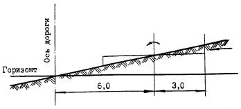 2.4. Забой для грейдер-элеватора целесообразно подготавливать двумя-тремя зарезаниями автогрейдера по одному следу для образования уступа высотой 0,3 - 0,35 м. 2.5. Если рельеф местности имеет косогор (при небольшом его уклоне), то до начала работы грейдер-элеватора следует срезать часть грунта косогора. Схема зарезания первого прохода грейдер-элеватора: