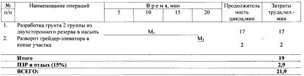 3.3. Спецодежда и спецобувь. 1. Комбинезон хлопчатобумажный 1 2. Рукавицы комбинированные двупалые 1 пара 4. Технологический процесс и организация труда4.1. Приведение грейдер-элеватора в рабочее положение. Режущий диск. Режущему диску придают положение, при котором угол захвата равен 47,5°, угол резания - 20°, установки - 55 - 60° (угол между горизонтальной поверхностью и плоскостью, проходящей по кромке ножа), заточки режущей кромки - 10 - 15°. На режущую кромку рекомендуется сделать наварку высокопрочного слоя стали. Плужная балка. Устанавливается таким образом, чтобы между режущими дисками и нижними барабанами ленточного транспортера оставался зазор около 4 см. Это необходимо для того, чтобы диск не резал ленту транспортера и зазор обеспечивал наименьшее просыпание грунта между диском и транспортером. Транспортер. Нижняя часть транспортера опускается как можно ниже, но чтобы он не касался поверхности грунта при работе. Верхняя часть транспортера с помощью натяжных муфт устанавливается на расстоянии 1 м от насыпного грунта. Лента транспортера должна быть отрегулирована от сбега ее в стороны. Дышло. Крепится рядом с последним правым отверстием (по ходу трактора) трактора-тягача. 4.2. График трудового процесса