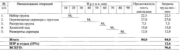 Зигзагообразная схема перемещения грунта из бокового резерва в насыпь: 1 - разгрузка грунта; 2 - набор грунта. 4.3. График трудового процесса рабочего цикла