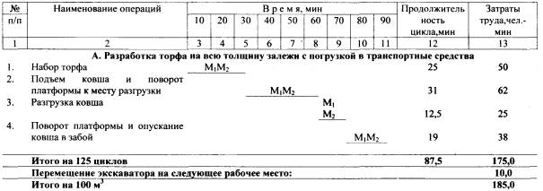 Примечание: В затраты труда по карте включено время на подготовительно-заключительные работы - 5 % и отдых - 10 %. Снижение затрат труда и повышение выработки на 4 % достигается за счет совмещения машинистами экскаваторов рабочих операций, рационального распределения механизмов и исполнителей на участке работ, бесперебойного обеспечения отряда автотранспортом. 2. Подготовка и условия выполнения процессов2.1. До начала работ по полному выторфовыванию необходимо: - очистить дорожную полосу от леса, пней, кустарника; - произвести разбивку земляного полотна; - подготовить пути для вывоза торфа и завоза грунта; - определить места складирования разработанного торфа и пригодность грунта в отведенных карьерах для устройства земляного полотна после выторфовывания (грунт должен обладать дренирующими свойствами); - снять растительный слой грунта на подходах к болоту; - укомплектовать механизированный отряд необходимым количеством автомобилей, исходя из объема и дальности перевозки торфа и завоза грунта; - нарастить кузова автосамосвалов, используемых для перевозки торфа, щитами; - обеспечить своевременную заправку механизмов горючесмазочными материалами. 2.2. Полное выторфовывание на болотах I и II типа (глубиной до 4 м) выполняется при возведении насыпей земляного полотна для автомобильных дорог с усовершенствованными облегченными типами покрытий. 2.3. К работе допускаются рабочие, прошедшие инструктаж по технике безопасности. Все мероприятия должны производиться в соответствии с правилами охраны труда при строительстве, ремонте и содержании автомобильных дорог, СНиП III-4-80, СНиП 12-03-99. 3. Исполнители, предметы и орудия труда3.1. Исполнители. 1. Машинист экскаватора 6 разряд (М1, М4) 2 2. Машинист бульдозера 6 разряд (М3) 1 3. Помощник машиниста экскаватора 5 разряд (М2, М5) 2 При необходимости устройства поверхностного водоотвода и понижения уровня грунтовых вод в состав механизированного отряда дополнительно включается экскаватор с грейферным оборудованием, выполняющий работу по устройству водоотводных канав. Водители автомобилей-самосвалов работают по отдельному наряду (путевому листу и в состав отряда не входят). 3.2. Машины, оборудование, инструменты, приспособления, инвентарь.