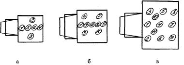 4.3. Для обеспечения устойчивости насыпи экскаватор разрабатывает котлован с заглублением в минеральное дно на 0,2 м. При наличии карьера с грунтом, применяемым для отсыпки земляного полотна, в непосредственной близости от места складирования торфа, применяется круговая схема работы автотранспорта. После выгрузки грунта автосамосвалы устанавливаются на место погрузки торфа под углом 15 - 25° к оси прохода экскаватора. Загрузка автосамосвала экскаватором производится по схеме (а, б, в), позволяющим наиболее рационально использовать объем кузова автосамосвала, оборудованного наращенными бортами для перевозки торфа на ЗИЛ-ММЗ-555 - 30 см, МАЗ-503 - 30 см, КраЗ-2565 - 10 см.