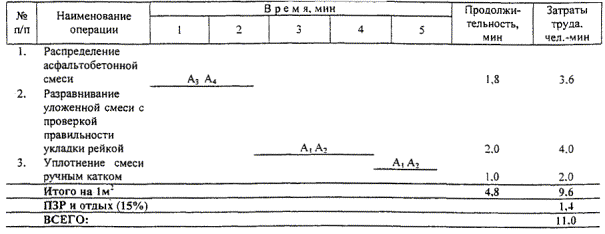Примечание: В затраты труда по карте включено время на подготовительно-заключительные работы - 5 % и отдых - 10 %. Снижение затрат труда и повышение выработки до 4 % достигается за счет рационального использования квалификационного состава звена при выполнении операций технологического процесса. 2. Подготовка и условия выполнения процесса2.1. Укрепление водоотводных канав горячей песчаной асфальтобетонной смесью необходимо выполнять в сухую погоду. 2.2. Перед укладкой асфальтобетонной смеси необходимо обеспечить ровность и плотность откосов водоотводных канав, выполнить разбивочные работы, проверить качество асфальтобетонной смеси. 2.3. Рабочие должны быть одеты в спецодежду, снабжены спецобувью, рукавицами и наколенниками. 2.4. К работе допускаются рабочие, прошедшие инструктаж по технике безопасности. 2.5. Работы следует выполнять согласно требованиям СНиП 3.06.03-85, СНиП III-4-80, СНиП 12-03-2001, Правил и инструкций по охране труда при строительстве, ремонте и содержании автомобильных дорог. 3. Исполнители, предметы и орудия труда3.1. Исполнители 1. Асфальтобетонщик 4 разряд (А1) 1 2. Асфальтобетонщик 3 разряд (А2) 1 3. « « « 2 разряд (А3, А4) 2 3.2. Машины, оборудование, инструменты, приспособления, инвентарь.