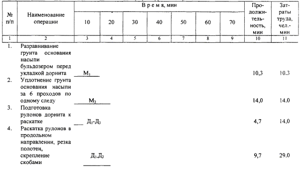 3.3. Спецодежда и спецобувь. Машинист бульдозера 1. Комбинезон хлопчатобумажный 1 2. Рукавицы комбинированные двупалые 1 пара Машинист катка самоходного с гладкими вальцами 1. Комбинезон хлопчатобумажный 1 2. Ботинки кожаные 1 пара 3. Рукавицы комбинированные 1 пара Дорожные рабочие 1. Костюм хлопчатобумажный 3 2. Ботинки кожаные 3 пары 3. Рукавицы комбинированные 3 пары 4. Жилет сигнальный 3 3.4. Потребность в синтетическом нетканом материале: дорнит в рулонах массой до 80 кг при ширине полотна 1,7 м на 100 м2 - 60 п.м. 4. Технология и организация процесса4.1. Технологический процесс по устройству слоя из синтетического нетканого материала (дорнита) в основании земляного полотна с раскаткой материала в продольном направлении состоит из следующих операций: - подготовка рулонов синтетического нетканого материала к раскатке; - раскатка рулонов внахлест в продольном направлении; - контроль качества работ. 4.2. График трудового процесса
