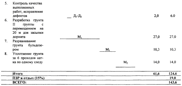 Примечание: В затраты труда включено время на подготовительно-заключительные работы - 2 % и отдых - 13 %. Применение карты позволит повысить производительность труда до 5 - 6 %. 2. Подготовка и условия выполнения процесса2.1. Перед устройством слоя из синтетического нетканого материала необходимо: подготовить основание насыпи; обеспечить временный и постоянный водоотвод. 2.2. Рулоны дорнита транспортируют и хранят в закрытой светонепроницаемой упаковке. Открытый (раскатанный) материал может находиться под действием солнечного света не более 10 часов. 2.3. Рулоны материала раскатывают вручную в продольном направлении на захватке длиной 50 - 100 м. В конце захватки полотно отрезают от рулона ножом, рулон поворачивают на 180° и следующее полотно раскатывают в обратном направлении с перекрытием предыдущего не менее 15 см. 2.4. После раскатки всего дорнита на участке проверяют качество уложенной прослойки путем визуального осмотра, фиксируя величину перекрытия, качество стыковки полотен, сплошность. 2.5. Отсыпку на дорнит материала вышележащего слоя необходимо вести с таким расчетом, чтобы дорнит находился под действием дневного света не более 5 часов. Отсыпку следует вести по способу «от себя» без заезда занятых на строительстве машин на открытое полотно дорнита. 2.6. В целях рационального использования машин и соблюдения требований безопасности, работа выполняется одновременно по разным сторонам автомобильной дороги с установкой по оси знаков безопасности и ограждений. Переход рабочих допускается только на полностью подготовленную полосу. 2.7. При производстве работ рабочие должны быть одеты в специальную одежду и спецобувь, соблюдать требования СНиП III-4-80, СНиП 12-03-2001, Правила охраны труда при строительстве, ремонте и содержании автомобильных дорог*, инструкции по охране труда рабочих. Места производства работ должны быть ограждены в соответствии с ВСН 37-84. 3. Исполнители, предметы и орудия труда3.1. Исполнители 1. Машинист бульдозера 6 разряд (М1) 1 2. Машинист катка 6 разряд (М2) 1 3. Дорожный рабочий 4 разряд (Д1) 1 4. Дорожный рабочий 2 разряд (Д2, Д3) 2 3.2. Машины, инструменты, приспособления, инвентарь