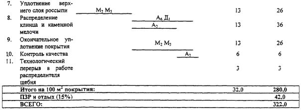 Примечание: В затраты труда включено время подготовительно-заключительные работы - 5 % и отдых - 10 %. Снижение затрат труда и повышение выработки на 15 % достигается за счет применения навесного распределителя щебня, а так же за счет рационального размещения исполнителей. 2. Подготовка и условия выполнения процесса2.1. Основание под покрытие из черного щебня должно быть ровным, прочным, сухим и чистым. Укладка черного щебня в дождь или на мокрое и загрязненное основание не допускается. 2.2. После просушки и очистки основания за 2 ч до начала укладки щебня по основанию равномерно (без пропусков) разливают жидкий битум классов СГ и МГ любой марки в количестве 0,5 - 0,7 л/м2 или эмульсию в количестве 1 - 1,5 л/м2. Новые незагрязненные основания, устроенные с применением органических вяжущих, вяжущими не обрабатываются. 2.3. В условиях отрицательных температур розлив по основанию эмульсии для подгрунтовки не допускается. 2.4. Для перевозки черного щебня следует использовать автосамосвалы с металлическим кузовом, внутренние стенки и дно которых во избежание прилипания щебня обработаны мазутом или нефтью с помощью специальных распылителей или вручную. 2.5. Перед укладкой щебня проверяют наличие паспорта на черный щебень, в котором указаны вид щебня, температура, время отправки и количество. 2.6. Скорость укладки в условиях пониженных температур должна быть не ниже 40 м/ч. Скорость катков рекомендуется в начале уплотнения в пределах 1,5 - 2 км/ч, а после 5 - 6 проходов по одному следу ее нужно увеличить: для катков с гладкими вальцами в пределах 3 - 5, для виброкатков - 2 - 3, для катков с пневматическими шинами - 5 - 8 км/ч. 2.7. При температуре воздуха от 0 до -5 °С укладку щебня выполняют только тяжелыми катками (20 - 25 проходов по одному следу). При этом число катков увеличивают в 1,5 раза по сравнению с обычными условиями. 2.8. В конце укладываемой полосы во избежание раскатывания смеси положить и закрепить костылями упорный брус, толщина которого должна быть равна толщине слоя покрытия в плотном теле. 2.9. Работы выполняются в соответствии с «Правилами производства работ» СНиП 3.06.03-85. 2.10. Работы следует выполнять, соблюдая правила техники безопасности СНиП III-4.80, СНиП 12-03-2001, а также «Правила охраны труда при строительстве, ремонте и содержании автомобильных дорог», СоюздорНИИ, М., «Транспорт», 1993 г, 3. Исполнители, предметы и орудия труда3.1. Исполнители 1. Машинист самоходного асфальтоукладчика ДС-1 (Д-150В) 6 разряд (М1) 1 2. Машинист тяжелого катка 6 разряд (М2, М3) 2 3. Машинист легкого катка 5 разряд (М4) 1 4. Асфальтобетонщик 5 разряд (А1) 1 5. То же 4 разряд (А2) 1 6. -"- 3 разряд (А3, А4) 2 7. -"- 2 разряд (А5, А6) 2 8. Дорожный рабочий 1 разряд (Д1) 1 3.2. Машины, инструменты, приспособления, инвентарь