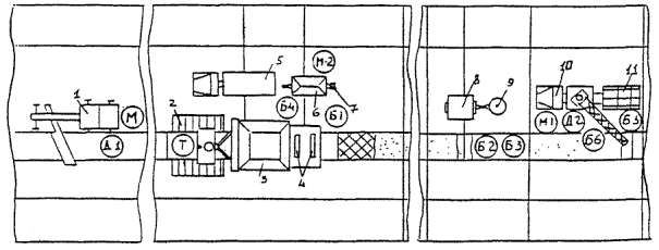 1 - автогрейдер; 2 - трактор; 3 - бункерный распределитель; 4 - вибраторы; 5 - автосамосвал; 6 - передвижная электростанция; 7 - емкость для битумной эмульсии; 8 - компрессор; 9 - емкость с битумной мастикой; 10 - автокран; 11 - прицепная тележка 5. Приемы труда