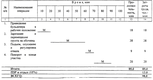 3.3. Спецодежда и спецобувь 1. Комбинезон хлопчатобумажный 1 2. Рукавицы комбинированные двупалые 1 пара 4. Технология и организация процесса4.1. При срезке обочин применяется челночная схема, при которой рабочий ход бульдозера производится при движении вперед, а холостой - при движении на задних передачах по одной и той же прямой. 4.2. Технологический процесс по срезке обочин при уширении проезжей части включает следующие операции: - приведение бульдозера в рабочее положение; - зарезание и перемещение грунта на обочины; - подъем, опускание и регулировка отвала; - повороты в конце участка. 4.2. График трудового процесса