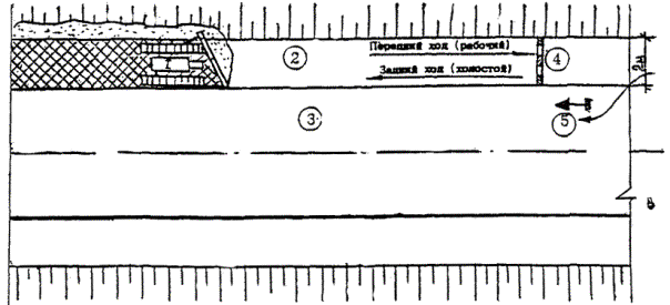 1 - бульдозер ДЗ-27; 2 - обочина; 3 - проезжая часть; 4 - ограждение; 5 - дорожный знак 5. Приемы труда