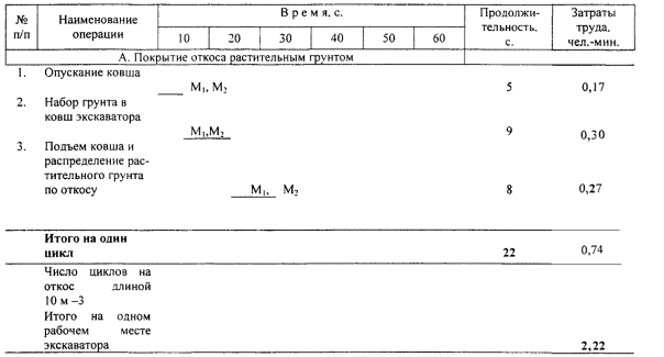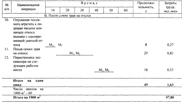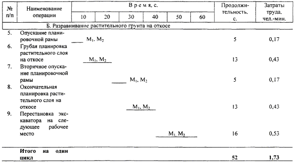 Примечание. Работы по замене ковша драглайна планировочной рамой и посевным агрегатом, а также заправке посевного агрегата семенами трав и минеральными удобрениями выполняются М1 и М2 в технологические перерывы. Трудозатраты приведены в графике трудового процесса. |