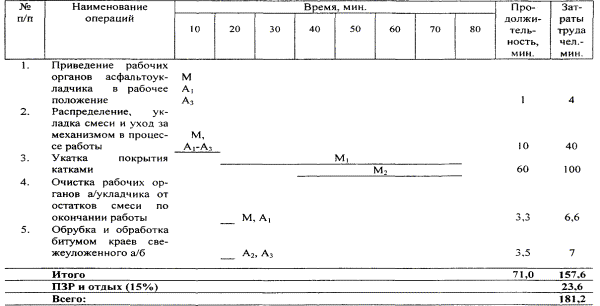 3.4. Норма расхода материалов на укладку 100 м2 покрытия (при толщине слоя 5 см): битум - 0,5 л/м2; асфальтобетонная смесь - 11,9 т. 4. Технология и организация процесса4.1. Технологический процесс по укладке асфальтобетонной смеси включает следующие операции: - приведение рабочих органов асфальтоукладчика в рабочее положение; - распределение и укладка асфальтобетонной смеси; - уход за механизмом в процессе работы; - укатка покрытия катками; - очистка рабочих органов асфальтоукладчика от остатков смеси по окончании работы; - обрубка и обработка битумом краев свежеуложенной полосы. 4.2. График трудового процесса