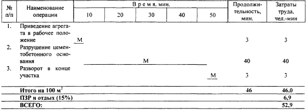 4. Технология и организация процесса4.1. Работы по разрушению цементобетонного основания с использованием машины БТЗ-7000 выполняются в следующей технологической последовательности: - приведение агрегата в рабочее положение; - разрушение цементобетонного основания; - поворот машины в конце участка. 4.2. График трудового процесса