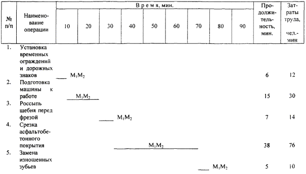 3.3. Спецодежда и спецобувь. 1. Комбинезон хлопчатобумажный 2 2. Ботинки кожаные 2 пары 3. Рукавицы комбинированные двупалые 2 пары 3.4. Потребность в воде и топливе (за смену): вода - 6 тонн (заправка 2 раза по 3 тонны); топливо - до 1,5 т. Потребность в зубьях за смену: по необходимости в зависимости от прочности срезаемого покрытия, зубья меняют 2 - 3 раза за смену. Количество заменных зубьев за смену: 15 - 20 штук. 4. Технология и организация процесса4.1. Работа по срезке асфальтобетонного покрытия выполняется в следующей технологической последовательности: - установка временных ограждений и дорожных знаков по технике безопасности; - приведение машины в рабочее положение; - россыпь щебня перед фрезерованием; - срезка асфальтобетонного покрытия и укладка его в валик; - замена изношенных зубьев; - заправка машины дизельным топливом и водой; - снятие и перестановка временных ограждений и дорожных знаков. 4.2. График трудового процесса