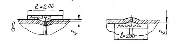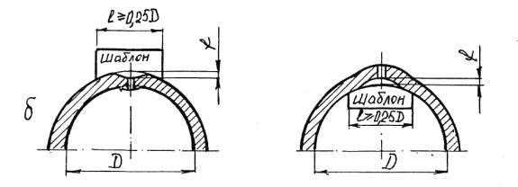 Где D max , D min - соответственно максимальное и минимальное значение внутреннего диаметра обечайки, мм; 3) отклонение толщины стенки обечайки, вследствие любых причин (дефектов), не должно выводить ее за пределы расчетного значения; 4) отклонение от прямолинейности образующей обечайки более ± 2мм на метр погонной длины, не допускается; 5) смещение кромок «в» в продольных швах, определяемое по внутренней поверхности должно быть не более 3мм. При этом кромки стыкуемых листов должны располагаться относительно друг друга согласно Черт.1 а. 6) отклонение от круглости (угловатость) в поперечном сечении зоны сварного шва (просвет f от шаблона длиной не менее 0,25 Д, где Д-внутренний диаметр обечайки) Черт.1б, в должно быть не более: для Д ≤ 1000 мм-0,5% Д; для Д ≥ 1000 мм-5 мм;