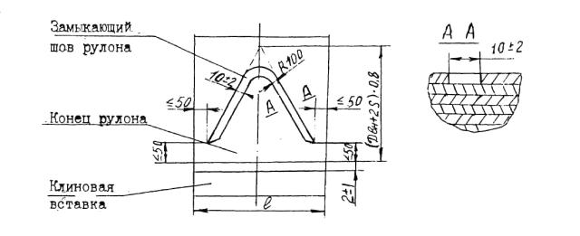 Для двухслойной стали глубина зачистки не должна выводить плакирующий слой за минимальную его толщину по ГОСТ 10885. Отслоение плакирующего слоя по кромкам разделки под сварку не допускается. Устранение отслоений производится по решению Главного конструктора предприятия-изготовителя. 5.2.3.11. Отклонение образующей обечайки от прямолинейности не должно быъ более 1,5 мм на всей длине. 5.2.4. Рулонированные обечайки5.2.4.1. При изготовлении рулонированной обечайки, для получения правильной концентрической формы, в начале (на центральной обечайке) и конце спиральной навивки следует располагать одну над другой клиновые вставки. 5.2.4.2. Клиновые вставки должны соответствовать требованиям: 1) ширина (по окружности обечайки) - не менее 300мм для обечаек внутренним диаметром до 1400мм и не менее 600мм при диаметре свыше 1400; 2) длина - на всю длину обечайки. Допускается изготавливать из отдельных частей, не сваренных между собой; 3) толщина тонкого конца - не более 0,3мм, толщина противоположного конца должна быть равна толщине рулонной стали; 4) поверхность не должна иметь неровностей, уступов, подрезов размерами более 0,3мм. 5.2.4.3. Расстояние между продольным швом центральной обечайки и началом клиновой вставки должно быть не менее трех толщин центральной обечайки. Зазор в стыковом соединении между клиновой вставкой и началом спиральной навивки должен находиться в пределах (10 ± 2) мм, а между клиновой вставки и концом спиральной навивки (2 ± 1) мм. 5.2.4.4. При изготовлении рулонированной обечайки из двух и более рулонов сварной шов, соединяющий концы рулонных полос, должен быть стыковым по ГОСТ 5264, ГОСТ 8713 и выполнен без приварки к нижележащему слою. Усиление шва должно быть зачищено заподлицо с основным металлом 5.2.4.5. Число спиральных слоев в многослойной рулонированной обечайке должно быть не менее семи слоев без учета клиновых вставок. 5.2.4.6. Замыкающий шов рулонированной обечайки должен быть выполнен в соответствии с Черт.3.