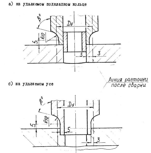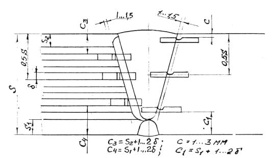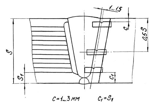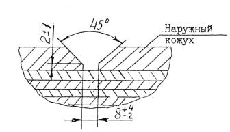 5.2.4.7. Наружный кожух должен быть изготовлен из листовой стали толщиной не менее суммарной толщины двух слоев спиральной навинки, при этом допускается изготавливать из нескольких листов, но не более чем из трех с продольными стыковыми швами. Допускается изготавливать кожух, из двух концентрических слоев рулонной стали. 5.2.4.8. Разделка кромок под сварку замыкающих продольных швов наружных кожухов должна соответствовать Черт.4. При толщине слоев кожуха 5 мм и менее разделку допускается выполнять без скоса кромок.