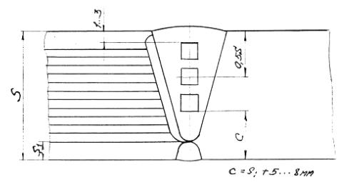 K – толщина наплавки поковки; С – толщина наплавки рулонированной обечайки; S1 – толщина центральной обечайки. Замер твердости производится в середине слоя Схема измерения твердости в сварном соединении вварки штуцера на полную толщину стенки рулонированной обечайки