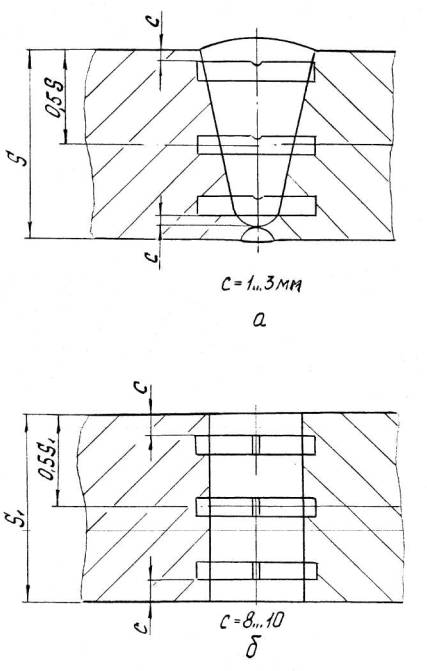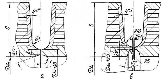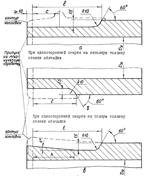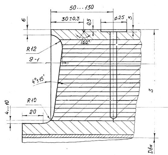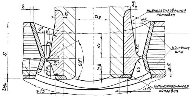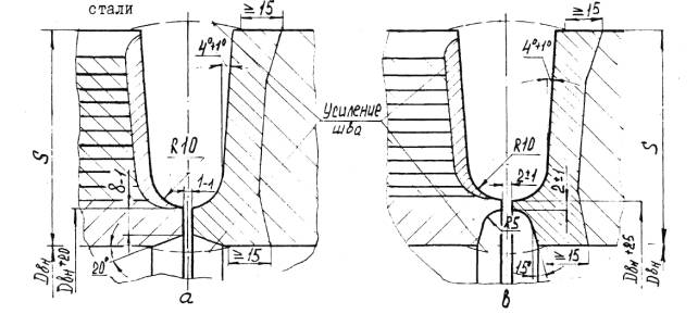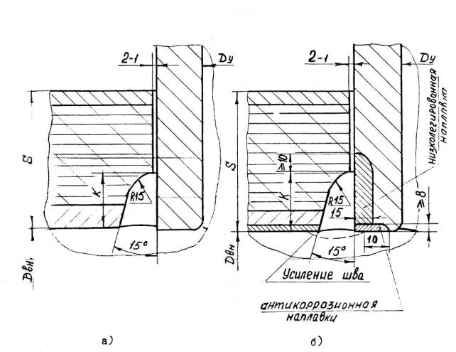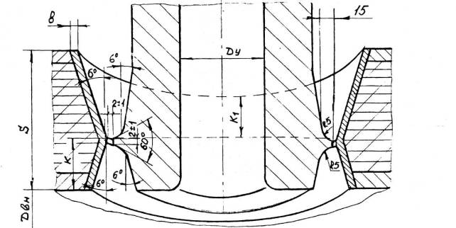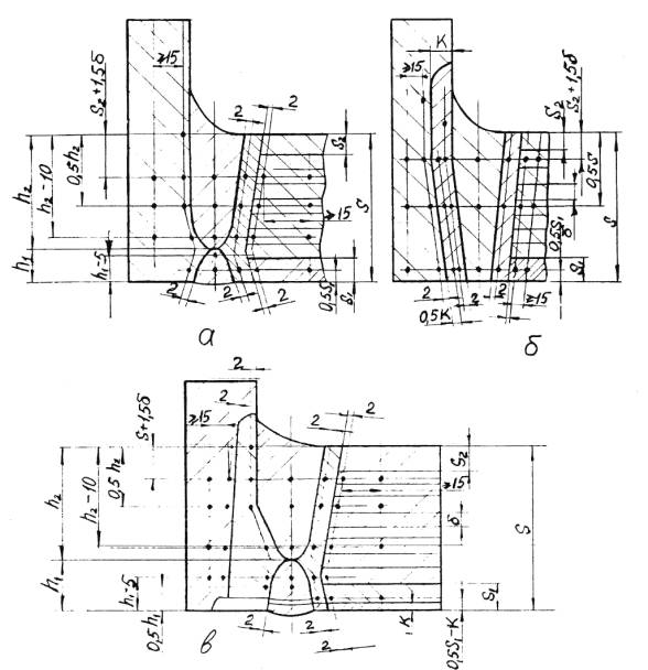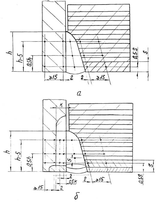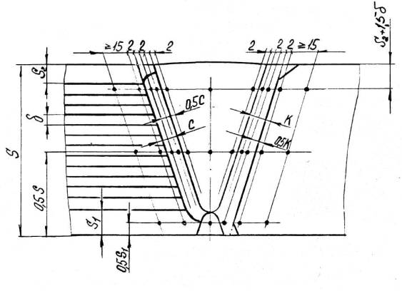 а – ручная и автоматическая сварка б – электрошлаковая сварка S1 – исполнительная толщина заготовки под штамповку Для сварных соединений, не подвергаемых термической обработке, проводятся испытания в полном объеме на образцах, вырезанных из производственных сварных соединений. Решение о вырезке образцов из производственных сварных соединений (термообработанных и не термообработанных) принимается предприятием-изготовителем, исходя из сложности последующего восстановительного ремонта. При получении отрицательных результатов и в этом случае сварные швы бракуются. 8.5.4.6. Результаты механических испытаний сварных соединений должны быть внесены в паспорт сосуда. 8.5.5. Металлографические исследования сварных соединений.8.5.5.1. Металлографические исследования сварных соединений определяющих прочность сосуда должны проводиться в соответствии с ОСТ 26-1379 и имеют целью выявление трещин, пор, раковин, непроваров, шлаковых включений, определение макро и микроструктуры и твердости всех зон сварного соединения. 8.5.5.2. Металлографические исследования проводятся на темплетах, вырезанных поперек шва каждого «контрольного сварного соединения». Контролируемая поверхность должна включать сечение шва с зонами термического влияния и прилегающими к ним участками основного металла. 8.5.5.3. При макроисследовании определяются макродефекты, твердость всех зон сварного соединения, за исключением твердости переходного слоя в аустенитной наплавке. При микроисследовании определяются микротрещины и микроструктуры всех зон сварного соединения. 8.5.5.4. Измерение твердости в поперечном сечении кольцевого шва, шва вварки (приварки) патрубка (штуцера), шва штампованной (вальцованной) детали производится в соответствии с Черт. 20, 21, 22, 23, 24, 25. 8.5.5.5. Качество сварного соединения при металлографических исследованиях должно соответствовать требованиям подраздела 5.11. 8.5.5.6. Если при металлографическом исследовании в контрольном сварном соединении, проверенном методом ультразвуковой дефектоскопии или радиографическим методом и признанном годным, будут обнаружены недопустимые внутренние дефекты, которые должны обнаруживаться этим методом неразрушащего контроля, все выполненные на сосуде сварные соединения, подлежат повторному контролю тем же методом в объёме 100%. При этом проверка качества всех производственных стыков должна осуществляться другим, более опытным и квалифицированным дефектоскопистом. В случае получения удовлетворительных результатов повторного контроля более опытным и квалифицированным дефектоскопистом сварные швы считаются годными. 8.5.5.7. При неудовлетворительных результатах металлографических исследований допускаются повторные исследования на удвоенном числе шлифов, вырезанных из того же контрольного соединения. В случае получения неудовлетворительных результатов при повторных металлографических исследованиях темплеты вырезаются из производственного шва сосуда с учетом п. 8.5.4.5 и подвергаются исследованиям в полном объеме. При отрицательных результатах исследований все производственные швы бракуются. 8.5.6. Измерение твердости сварных соединений8.5.6.1. Контроль твердости сварных соединений должен производиться по наружной поверхности сосуда (сборочной единицы) после окончательной термической обработки сварных