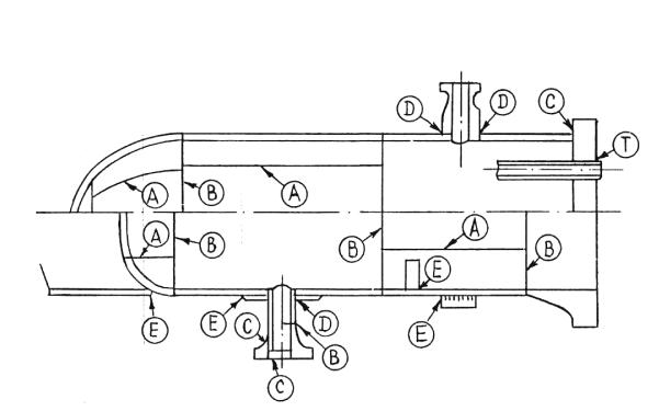 Примечания: 1. ВО-внешний осмотр, ЦД-цветной метод контроля; УЗД-ультразвуковой метод дефектоскопии; РГ-радиографический метод. 2. Знак «+» соответствует слову «и», запятая-слову «или». 3. Категории сварных соединений приведены на Черт. 27. К категории А относятся продольные сварные швы в обечайках, в сферических и эллиптических днищах и их заготовках. К категории В относятся кольцевые сварные швы в обечайках, кольцевые сварные швы, соединяющие кованые, штампованные, рулонированные обечайки между собой и с днищами, фланцами, горловинами. К категории С относятся сварные швы, соединяющие фланцы, трубные доски с обечайками, а также фланцы с патрубками. К категории Д относятся сварные швы вварки (приварки) штуцеров, патрубков, горловин в обечайки, днища. К категории Е относятся сварные швы приварки опорных конструкций, приварных элементов к корпусу. К категории Т относятся швы приварки труб к трубной решетке; в многослойных обечайках-дополнительно швы приварки клиновой вставки к центральной обечайке, швы стыковки концов рулонной полосы, замыкающие швы рулонной полосы.