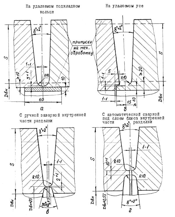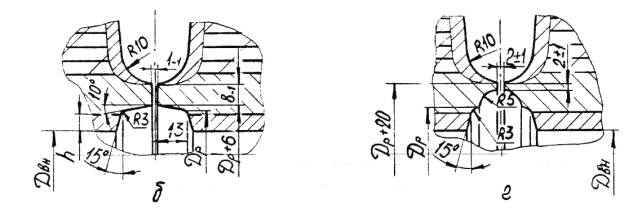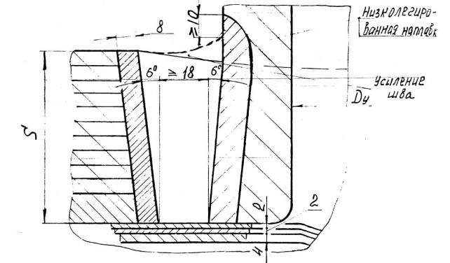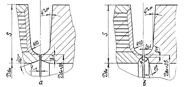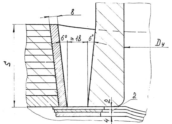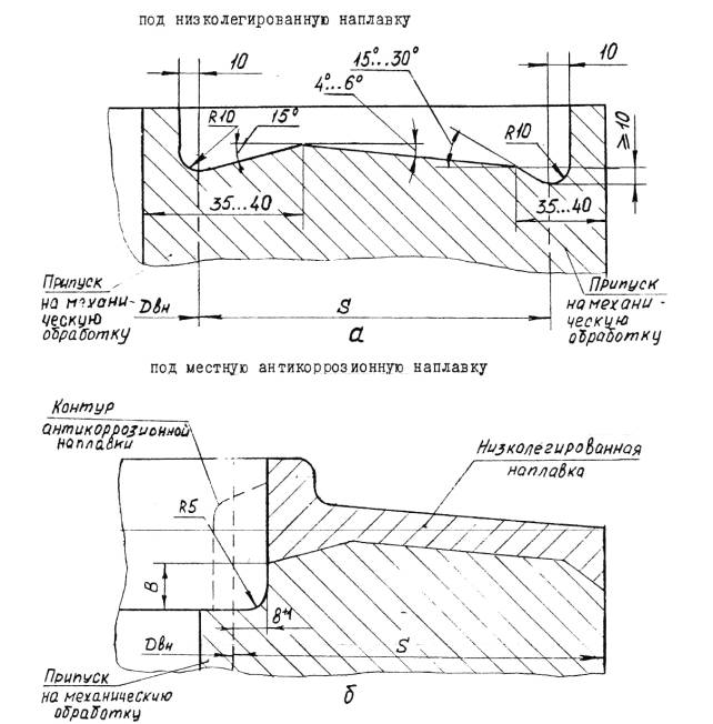 5.2.4.9. Замыкающий продольный сварной шов наружного кожуха должен быть смещен относительно шва приварки клиновой вставки по длине окружности не менее чем на значение наружного диаметра. Продольные швы кожуха из концентрических слоев рулонной стали должны быть смещены относительно друг друга не менее чем на 30° по дуге. 5.2.4.10. Рулонированные обечайки по внутреннему диаметру после намотки слоев и кожуха должны отвечать требованиям: 1) отклонение от номинального размера - в соответствии с п. 5.1.11 перечисление 2); 2) отклонение от круглости (овальность) обечайки не должно приводить при сборке корпуса под сварку к смещению кромок более норм, указанных в п.п. 5.12.3, 5.12.4; 3) отклонение от круглости (угловатость) в поперечном сечении зоны продольного сварного шва-в соответствии с п. 5.2.3.7. 1) от 0,1 до 0,3мм, включительно, суммарной протяженностью более 10% длины развертки спиральной навивки и наружного кожуха в обечайках внутренним диаметром до 1400 мм, включительно; 2) от 0,3 до 1мм суммарной протяженностью более 2% длины развертки спиральной навивки сосудов диаметром до 1400мм; 3) от 0,1 до 0,6мм суммарной протяженностью не более 5% и от 0,6 до 1,5мм включительно суммарной протяженностью не более 1% длины развертки спиральной навивки и наружного кожуха в обечайках внутренние диаметром свыше 1400мм. В зонах продольных сварных швов рулонированных обечаек допускаются местные зазоры до 2,5мм, которые после механической обработки торцев перед наплавкой должны быть заполнены вставками из рулонной стали навитых слоев или из листовой стали марок Ст3СП, 20, 09Г2С, 10Г2С1. 5.2.4.12. Для создания дренажной системы и выхода диффундирующих газов в многослойной рулонированной обечайке до наплавки торцев должны быть просверлены отверстия на расстоянии 50-130мм от торца на всю толщину многослойной части до первого слоя спиральной навивки. Диаметр отверстия должен быть не менее 8мм. Отверстия необходимо располагать равномерно по длине наружной окружности с шагом не более одного метра. При этом, число отверстий должно быть не менее 4 с каждого торца, но не более 8. 5.2.4.13. После намотки торцы рулонированных обечаек должны быть механически обработаны, наплавлены и вновь механически обработаны под сварку. Форма разделок под наплавку и сварку должна соответствовать указанным в приложении 20. В технически обоснованных случаях по согласованию с ИркутскНИИхиммашем допускается не наплавлять торцы рулонированных обечаек. 5.2.4.14. Толщина наплавленного металла с учетом проплавления на торцах рулонированных обечаек после механической обработки наплавки должна быть не менее 8 мм для обечаек с внутренним диаметром до 1400мм, включительно и не менее 10мм - для обечаек с внутренним диаметром более 1400мм. В зоне между наружным кожухом и последним слоем спиральной навивки обечайки допускается уменьшение толщины наплавки на 2 мм. 5.2.4.15. На наплавленных торцах допускается утяжка кромок рулонированных обечаек и искривление образующих внутренней и наружной поверхностей на участке до 20мм от края разделки. Утяжка кромки внутренней поверхности не должна быть более 5мм в сторону увеличения диаметра. Утяжка кромки по наружной поверхности не нормируется. 5.3. Требования к выпуклым штампованным днищам, крышкам и горловинам5.3.1. Штамповка и термообработка монолитных и многослойных выпуклых днищ эллиптической и полуш