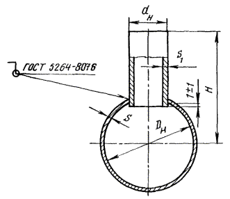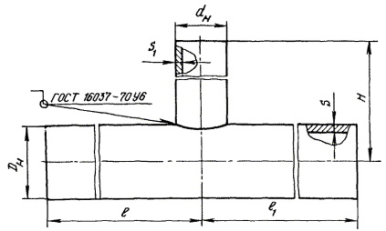 Приказом Министерства монтажных и специальных строительных работ СССР от 18 февраля 1981 г. № 45 срок введения установлен с 1 июля 1981 г. Несоблюдение стандарта преследуется по закону. 1. Настоящий стандарт распространяется на ответвления (врезки) неусиленные и усиленные накладками для соединения трубопроводов из углеродистой стали под углом 90°. 2. Конструкция неусиленных ответвлений должна соответствовать указанной на черт. 1. 2.1. По согласованию с проектной организацией при отношении dн/Dн не свыше 0,5 неусиленные ответвления (упрощенные врезки) допускается выполнять как указано на черт. 2. Черт. 1 Черт. 2 3. Конструкция и размеры ответвлений, усиленных накладками, должны соответствовать указанным на черт. 3 и в таблице. 3.1. Толщину накладок следует принимать равной толщине стенки трубы диаметром Dн. 3.2. Накладки должны плотно прилегать к наружной поверхности трубопровода. Зазор, замеренный в любой точке периметра накладки, должен быть не более 2 мм. 3.3. Допускается применение кольцевых накладок, выполненных как одна деталь, без сварного шва. 4. Материал, толщина стенки и условия применения неусиленных и усиленных накладками ответвлений - по ОСТ 36-41-81. 5. Не допускается вварка штуцеров ответвлений в сварные швы трубопровода. 6. Размеры Н, l и l1 должны соответствовать указания проектной документации либо приниматься изготовителем с учетом условий изготовления, транспортирования и монтажа, но должны быть не менее вычисленных по формулам: Н = 0,5Dн + 100 мм; l (l1) = 0,5dн + 100 мм - для неусиленных ответвлений; l (l1) = 0,5D + 100 мм - для ответвлений, усиленных накладками. 7. Технические требования - по ОСТ 36-49-81. Пример условного обозначения неусиленного ответвления Dу 200 мм, dу 100 мм: Ответвление 200×100 ОСТ 36-45-81; то же, но выполняемое, как показано на черт. 2: Ответвление У 200×100 ОСТ 36-45-81; то же, но усиленное накладкой: Ответвление Н 200×100 ОСТ 36-45-81. Черт. 3 Размеры накладок мм