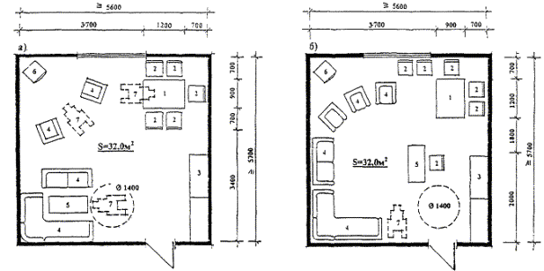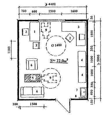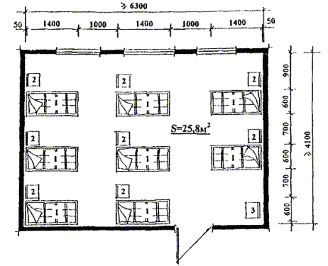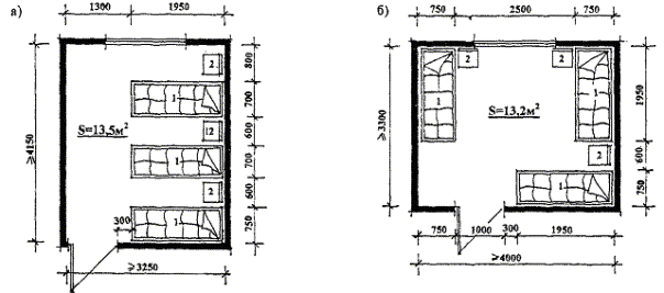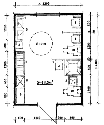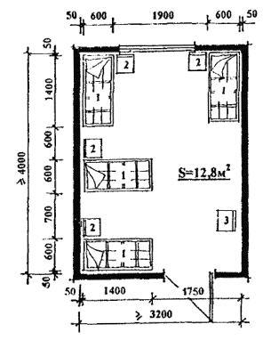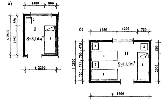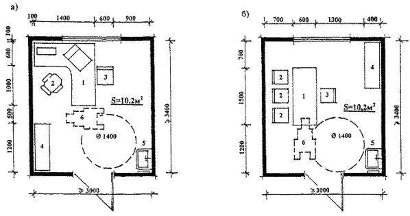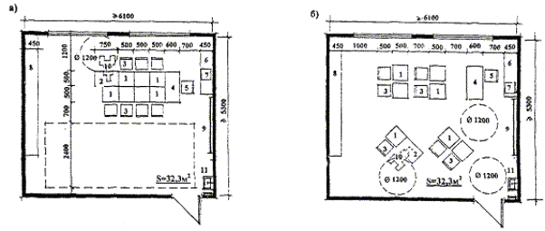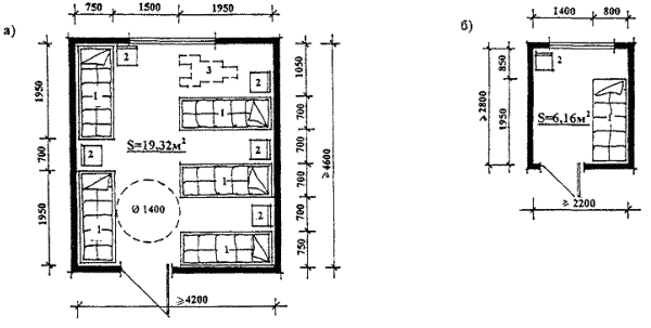 ЭКСПЛИКАЦИЯ ОБОРУДОВАНИЯ 1. Детский унитаз 2. Душевой поддон 3. Поворотное кресло 4. Банкетка 5. Детский умывальник 6. Ногомойка 7. Вешалка для полотенца 8. Поддон для мойки горшков 9. Шкаф для хранения горшков и моющих средств 10. Место для инвалидной коляски Рис. П.11. Санитарный узел для дошкольников. ЭКСПЛИКАЦИЯ ОБОРУДОВАНИЯ 1. Кровать 2. Стул Рис. П.12. Спальная на 3 места для подростков, оказавшихся в трудной жизненной ситуации. Варианты планировки: а и б. ЭКСПЛИКАЦИЯ ОБОРУДОВАНИЯ 1. Кровать 2. Стул 3. Место для инвалидной коляски Рис. П.13. Спальная на 3 места для подростков с ограниченными возможностями и оказавшихся в трудной жизненной ситуации. Варианты планировки: а и б. ЭКСПЛИКАЦИЯ ОБОРУДОВАНИЯ 1. Стол ученический 5. Умывальник 2. Стул 6. Вешалка для полотенца 3. Стол учителя 7. Стол ученический для инвалида 4. Классная доска 8. Место для инвалидной коляски Рис. П.14. Комната приготовления уроков: а - для детей оказавшихся в тяжелой жизненной ситуации, б - для несовершеннолетних с ограниченными возможностями. ЭКСПЛИКАЦИЯ ОБОРУДОВАНИЯ 1. Игровой стол 4. Мягкая мебель 1. Стул 5. Журнальный стол 3. Комбинированный шкаф 6. Телевизор 7. Место для инвалидной коляски Рис. П.15. Гостиная. Примеры расстановки оборудования: а и б. ЭКСПЛИКАЦИЯ ОБОРУДОВАНИЯ I - спальная на 1 место 1. Кровать 2. Стул II - спальная на 3 места 1. Кровать 2. Стул Рис. П.16. Спальные комнаты на 1 (а) и на 3 (б) места для подростков с асоциальным поведением. ЭКСПЛИКАЦИЯ ОБОРУДОВАНИЯ 1. Кровать 4. Рабочий стол 2. Прикроватная тумбочка 5. Стул 3. Шкаф-купе 6. Место для инвалидной коляски Рис. П.17. Жилая комната на 3 места социальной гостиницы. Примеры планировки: а и б. ЭКСПЛИКАЦИЯ ОБОРУДОВАНИЯ 1. Стол - стеллаж с музыкальным центром 2. Мягкая мебель 3. Телевизор с видеомагнитофоном 4. Журнальный стол 5. Умывальник 6. Вешалка для полотенца 7. Ковер (мягкое покрытие) 8. Место для инвалидной коляски Рис. П.18. Гостиная социальной гостиницы. ЭКСПЛИКАЦИЯ ОБОРУДОВАНИЯ 1. Стол-шкаф кухонный 2. Холодильник 3. Мойка 4. Плита 5. Навесные полки 6. Стул 7. Обеденный стол 8. Складной обеденный стол 9. Место для инвалидной коляски Рис. П.19. Кухня-столовая в социальной гостинице. ЭКСПЛИКАЦИЯ ОБОРУДОВАНИЯ 1. Кресло стоматологическое 2. Столик инструментальный 3. Установка стоматологическая универсальная 4. Винтовой табурет 5. Плевательница 6. Светильник 7. Шкаф медицинский 8. Умывальник 9. Бачок для мусора 10. Стоп врача 11. Стул 12. Место для инвалидной коляски Рис. П.20. Кабинет стоматолога. ЭКСПЛИКАЦИЯ ОБОРУДОВАНИЯ