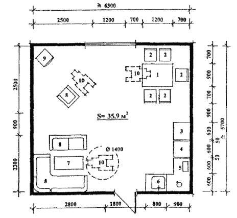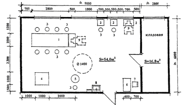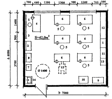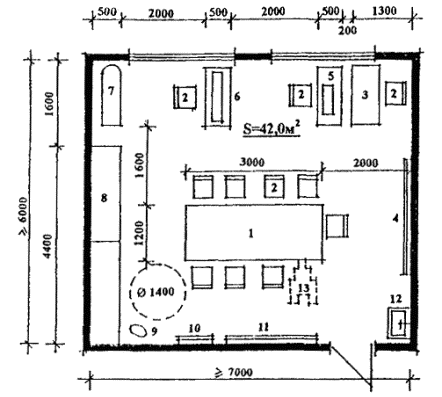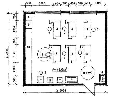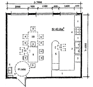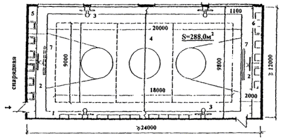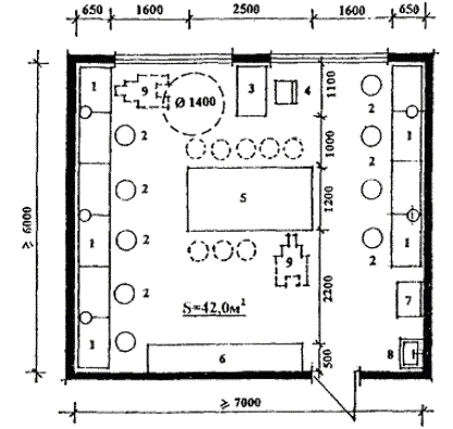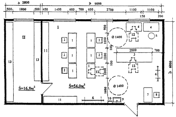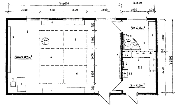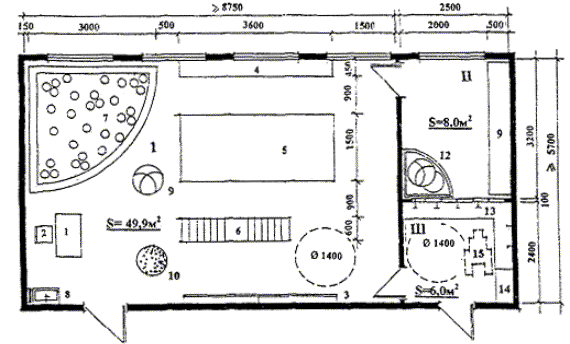 Рис. П.26. Мастерская судомоделирования с кладовой. ЭКСПЛИКАЦИЯ ОБОРУДОВАНИЯ 1. Верстак руководителя 2. Табурет 3. Верстак столярный 4. Станок сверлильный настольный 5. Точило наждачное 6. Станок фуговально-распиловочный 7. Клееварка 8. Урна для мусора 9. Встроенный шкаф для спецодежды 10. Шкаф-стеллаж для инструментов и материалов 11. Раковина 12. Место для инвалидной коляски Рис. П.27. Мастерская по обработке дерева. ЭКСПЛИКАЦИЯ ОБОРУДОВАНИЯ 1. Шкаф для книг и пособий 2. Муфельная печь 3. Доска классная 4. Верстак руководителя 5. Табурет 6. Верстак слесарный 7. Точило наждачное 8. Наковальня 9. Станок токарный 10. Станок сверлильный 11. Встроенный шкаф для спецодежды 12. Шкаф - стеллаж для инструментов и материалов 13. Урна для мусора 14. Раковина 15. Место для инвалидной коляски Рис. П.28. Мастерская по обработке металла. ЭКСПЛИКАЦИЯ ОБОРУДОВАНИЯ I. МАСТЕРСКАЯ 4. Швейная машина 9. Умывальник 1. Стол ученический для 5 Табурет регулируемый 10. Вешалка для полотенца индивидуальной работы 6. Мольберт 11. Шкаф для экспозиций 2. Стул 7. Стол мастера 12. Место для инвалидной коляски 3. Рабочий стол 8. Стул мастера II. КЛАДОВАЯ 13. Комбинированный шкаф Рис. П.29. Театрально-художественная мастерская (изготовление костюма), с кладовой ЭКСПЛИКАЦИЯ ОБОРУДОВАНИЯ 1. Рабочий стол 5. Гончарный круг 2. Стол для индивидуальной работы 6. Стол специалиста 3. Табурет 7. Стул 4. Печь для обжига 8. Умывальник с вешалкой для полотенца 9. Место для инвалидной коляски Рис. П.30. Мастерская лепки с печью для обжига, кладовой хранения инвентаря и готовых изделий. ЭКСПЛИКАЦИЯ ОБОРУДОВАНИЯ I. Мастерская 1. Стол мастера 2. Стул мастера 3. Рабочий стол 4. Столы с оборудованием 5. Табурет регулируемый 6. Ширма для представлений 7. Шкаф для экспозиций 8. Умывальник 9. Вешалка для полотенца 10. Место для инвалидной коляски II. Кладовая 11. Шкаф комбинированный Рис. П.31. Мастерская кукольного театра (изготовление кукол) с кладовой ЭКСПЛИКАЦИЯ ОБОРУДОВАНИЯ 1. Рабочий стол с прибором для выжигания 2. Табурет 3. Стол мастера 4. Стул 5. Рабочий стол для рисования 6. Стеллаж 7. Урна для мусора 8. Умывальник 9. Место для инвалидной коляски Рис. П.32. Мастерская по выжиганию по дереву. экспликация оборудования 1. Стол-шкаф кухонный 2. Холодильник 3. Мойка 4. Электроплита с воздухоочистителем 5. Сервировочная стойка с разделочным столом 6. Умывальник 7. Вешалка для полотенца 8. Обеденный стол 9. Стул 10. Стол резервный 11. Место для инвалидной коляски Рис. П.33. Мастерская кулинарного творчества ЭКСПЛИКАЦИЯ ОБОРУДОВАНИЯ 1. Стол рабочий 2. Стул складируемый 3. Стол педагога 4. Доска меловая 5. Швейная машина 6. Вязальная машина 7. Гладильная доска 8. Стеллаж с отделением для выставки 9. Манекен 10. Зеркало 11. Стенд 12. Умывальник 13. Место для инвалидной коляски Рис. П.34. Мастерская кройки, шитья и вязания. ЭКСПЛИКАЦИЯ ОБОРУДОВАНИЯ 1. Места складирования секций с креслами 2. Ширма Рис. П.35. Актовый зал на 80 мест. Вариант расстановки оборудования при использовании зала для танцев и массовых игр. ЭКСПЛИКАЦИЯ ОБОРУДОВАНИЯ 1. Стенка гимнастическая 2. Щит баскетбольный основной 3. Щит баскетбольный тренировочный 4. Съемная баскетбольная сетка 5. Тренажер «Лидер» 6. Тренажер «Стенка здоровья» 7. Ворота для минифутбола Рис. П.36. Спортивный зал. |