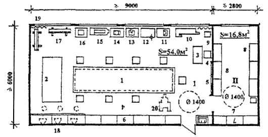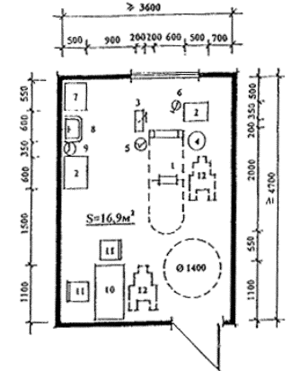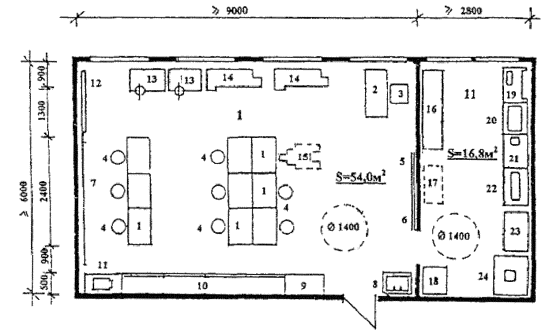 Рис. П.22. Зал развития моторики ЭКСПЛИКАЦИЯ ОБОРУДОВАНИЯ 1. Стол 2. Стул 3. Стол специалиста 4. Кресло 5. Шкаф-стеллаж 6. Умывальник 7. Вешалка для полотенца 8. Место для инвалидной коляски Рис. П.23. Кабинет групповой психотерапии. ЭКСПЛИКАЦИЯ ОБОРУДОВАНИЯ 1. Виброкушетка 2. Виброкресло 3. Столик для специальной аппаратуры 4. Установка с водяным каскадом 5. Стул специалиста 6. Штора 7. Место для инвалидной коляски Рис. П.24. Кабинет релаксации. ЭКСПЛИКАЦИЯ ОБОРУДОВАНИЯ 1 - мастерская 1. Стол рабочий 2. Стол мастера 3. Стул 4. Табурет 5. Доска меловая настенная 6. Экран свертывающийся 7. Стенд настенный 8. Раковина 9. Шкаф для спецодежды 10. Стеллаж 11. Подставка для проекционной аппаратуры 12. Стенд для инструментов 13. Верстак слесарный 14. Верстак столярный 15. Место для инвалидной коляски 11 - кладовая 16. Стеллаж 17. Станок фуговально-распиловочный передвижной 18. Шкаф вытяжной 19. Электроточило 20. Станок настольный сверлильный 21. Стол - подставка под оборудование 22. Электрокипятильник 23. Шкаф для приборов и инвентаря 24. Электроклееварка Рис. П.25. Мастерская технического творчества с кладовой. ЭКСПЛИКАЦИЯ ОБОРУДОВАНИЯ 1 - мастерская, 11 - кладовая.
