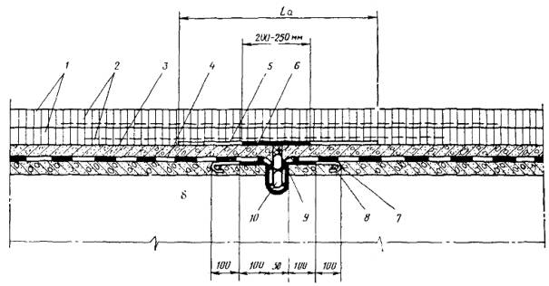 1 - покрытие; 2 - армирующие сетки; 3 - защитный слой; 4 - гидроизоляция; 5 - отделяющая прокладка; 6 - пластина, перекрывающая зазор; 7 - компенсатор; 8 - анкерный стержень; 9 - мастика; 10 - пористый заполнитель