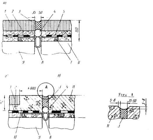 Рис. 2. Деформационные швы с заполнением мастикой при асфальтобетонном покрытии (а); при устройстве бетонного прилива (б) и при цементобетонном покрытии (в):