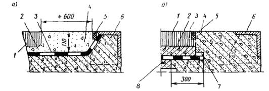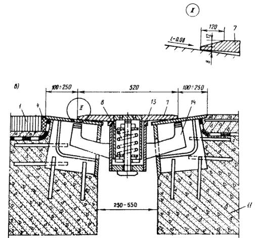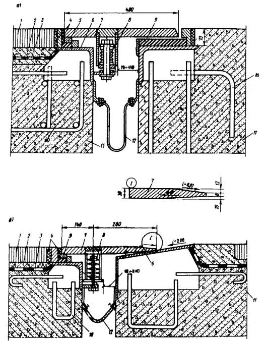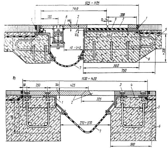 с гребенчатой скользящей плитой (тип ПГ-С) - плита одной стороной опирается на окаймление неподвижно, а другой стороной, имеющей зубья, скользит по резиновой прокладке (рис. 5,а);