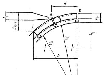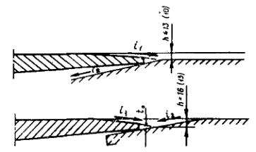Марка стали М16С (Ru = 200 МПа). Требуемые толщины скользящего листа с учетом ослабления сечения листа отверстиями под обоймы (стаканы) с пружинам и приведены на эпюре материалов (см. рисунок данного приложения). Учитывая требования к профилю неровности, образуемой швом (глубина неровности h ≤ 16 мм, угол перелома i1 + i2 ≤ 0,16), необходимую глубину скоса tв листа сверху определяем из соотношения (см. рис. 7 и рисунок данного приложения):