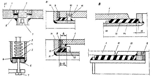 Рис. 3. Пример конструкций деформационных швов с одним (а, б) и двумя (в) рядами резиновых компенсаторов К-8;
