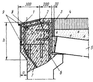 1 - окаймление; 2 - гребенчатая плита; 3 - высокопрочный болт; 4 - ребро жесткости; 5 - хомут; 6 - монолитный бетон, укладываемый после монтажа конструкций швов; 7 - водоотводный лоток; 8 - пружина в стакане; 9 - резиновая прокладка