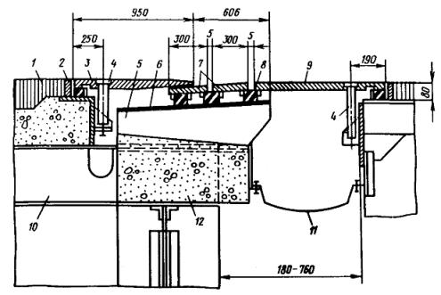 1 - окаймление; 2 - ребро жесткости; 3 - резиновый компенсатор; 4 - заклинивающая полоса; 5 - зазор, заполняемый мастикой; 6 - закладная деталь; 7 - анкеры; 8 - хомут; 9 - концевой участок плиты, бетонируемый при установке конструкций швов 10 - продольное ребро; 11 - опорная балка; 12 - резиновая прокладка; 13 - ниша в окаймлении