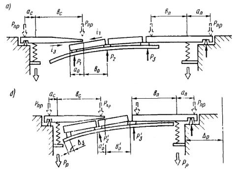 Вертикальные перемещения концов пролетных строений (например, сталежелезобетонных пролетом 42 м), определяемые по углу поворота торца балки 0,0065 и расстоянию от оси опирания до торца 0,55 м, вызывают перемещения листа по осям пружин: