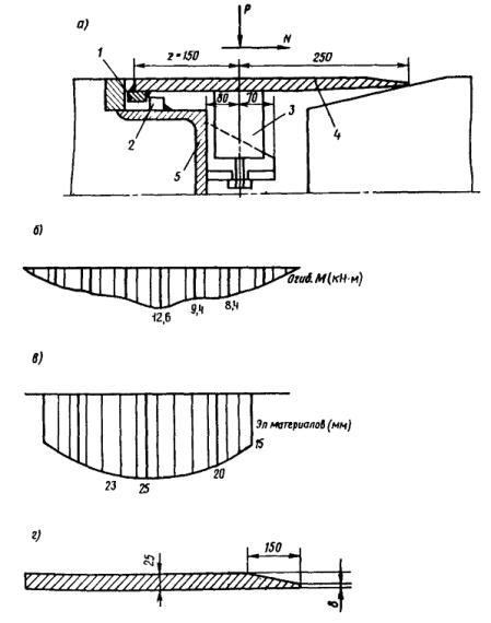 поперечное сечение конструкции шва (а); огибающая эпюра изгибающих моментов (б); эпюра требуемых толщин листа (в); принятые размеры листа (г); 1 - опорная планка; 2 - ограничитель; 3 - стакан пружины; 4 - сколъзящий лист; 5 - окаймление