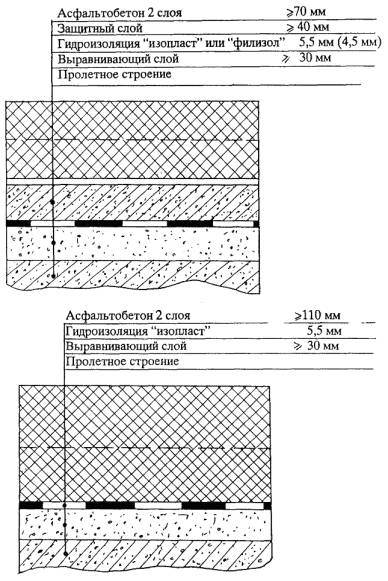 ФЕДЕРАЛЬНЫЙ ДОРОЖНЫЙ ДЕПАРТАМЕНТ РУКОВОДСТВО Утверждаю Первый заместитель генерального Директора федерального дорожного Департамента Минтранса РФ О.В. Скворцов 14.12.95 г. Москва 1996 г. Настоящее руководство составлено на основании лабораторных исследований новых гидроизоляционных материалов и опыта применения их при строительстве и ремонте мостовых сооружений; Автозаводского моста через р. Москву в г. Москве, путепроводов на МКАД, путепровода на 24 км Ленинградского шоссе, Высокояузского моста в г. Москве и др. Материалы филизол и изопласт существенно превосходят по своим показателям гидростеклоизол (температура хрупкости 0 ºС), имеют высокую прочность, низкую (ниже минус 30 ºС) температуру хрупкости вяжущего и не уступают лучшим зарубежным материалам. Прогнозируемый срок службы этих материалов в дорожной одежде - не менее 30 лет. По всем вопросам, связанным с устройством гидроизоляции по настоящему руководству, обращаться в Союздорнии по адресу: 143900, Балашиха Московской обл., шоссе Энтузиастов, 79. Тел. 521-01-11. Руководство разработано в Союздорнии к.т.н. И.Д. Сахаровой и инж. В.Ю. Казаряном. РУКОВОДСТВО ПО УСТРОЙСТВУ КОНСТРУКЦИИ ДОРОЖНОЙ ОДЕЖДЫ НА МОСТОВЫХ СООРУЖЕНИЯХ С ГИДРОИЗОЛЯЦИЕЙ ИЗ МАТЕРИАЛОВ «ИЗОПЛАСТ» И «ФИЛИЗОЛ» 1. ОБЩИЕ ПОЛОЖЕНИЯ1.1. Настоящее руководство разработано в развитие СНиП 2.05.03-84 /1/, СНиП 3.06.04-91 /2/, ВСН 32-81 /3/ и применяется на всей территории России. 1.2. Устройство гидроизоляции по настоящему руководству может быть выполнено на железобетонных и сталежелезобетонных пролетных строениях любых статических схем в районах строительства с минимальной температурой воздуха наиболее холодных суток с обеспеченностью 0,92 до минус 50 С включительно (см. Приложение 1, составленное на основании СНиП 2.01.01-82 /4/). (Измененная редакция. Изм. от 23.10.96 г.) 1.3. В районах строительства с температурой до минус 40 ºС включительно гидроизоляцию выполняют из изопласта или филизола; в районах с температурой ниже минус 40 ºС гидроизоляцию выполняют из материала филизол. В районах с температурой ниже минус 50 °С гидроизоляцию можно выполнять из битумно-бутилкаучуковой мастики Вента-У по соответствующим рекомендациям. (Измененная редакция. Изм. от 23.10.96 г.) 2. КОНСТРУКЦИЯ ДОРОЖНОЙ ОДЕЖДЫ2.1. Конструкцию дорожной одежды на проезжей части выполняют по одному из двух вариантов (рис. 1): состоящей из выравнивающего слоя минимальной толщиной 30 мм, гидроизоляции из материалов изопласт или филизол, армированного бетонного защитного слоя толщиной не менее 40 мм, двухслойного асфальтобетонного покрытия толщиной не менее 70 мм; или из выравнивающего слоя минимальной толщиной 30 мм, гидроизоляции из материала изопласт и двухслойного асфальтобетонного покрытия толщиной не менее 110 мм (в этой толщине 40 мм асфальтобетона выполняют функцию защитного слоя). Рис. 1 2.2. На пролетных строениях из блоков ПРК, коробчатых блоков или на железобетонных плитах сталежелезобетонных пролетных строений при состоянии верхней поверхности плит, удовлетворяющем требованиям настоящего Руководства, выравнивающий слой можно не устраивать. 2.3. Для выравнивающего слоя применяют мелкозернистый (песчаный) бетон класса по прочности на сжатие не ниже В 20 с маркой по водонепроницаемости W 8 по ГОСТ 12730.5-84x /5/, и маркой по морозостойкости в зависимости от климатических условий района строитель