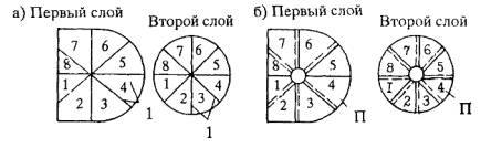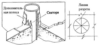 1 - линия разреза; П - линии перегиба секторов в раструб трубки; 1-8 - последовательность при раскрое и укладке; ----- - кромки стыкуемых секторов Рис. 5. 6. ТРЕБОВАНИЯ К ОБОРУДОВАНИЮ И ГИДРОИЗОЛИРОВЩИКАМ ПРИ ВЫПОЛНЕНИИ ГИДРОИЗОЛЯЦИОННЫХ РАБОТ6.1. По гидроизоляции не допускается движения транспортных средств, кроме подвозящих бетонную смесь для защитного слоя или асфальтобетонную смесь для покрытия при применении материала изопласт. 6.2. На выполненной гидроизоляции не допускается торможение и разворот автомобилей. Движение гладковальцовых катков по гидроизоляции не допускается. 6.3. Рабочие, занимающиеся укладкой гидроизоляции, должны быть обуты в обувь с гладкой подошвой, чтобы избежать повреждения гидроизоляции. 6.4. Протекторы на всем оборудовании, перемещающемся по гидроизоляции, должны регулярно проверяться и застрявшие в них каменные материалы удаляться (автосамосвалы, подвозящие бетонную и асфальтобетонную смесь, асфальтоукладчик). 7. УСТРОЙСТВО ЗАЩИТНОГО СЛОЯ7.1. Защитный слой гидроизоляции выполняют после приемки гидроизоляции, устранения обнаруженных дефектов и составления акта на скрытые работы установленного образца. 7.2. Защитный слой выполняют из материалов в соответствии с требованиями п.п. 2.1, 2.5 настоящего Руководства. 7.3. Устраивать защитный слой гидроизоляции следует не позже, чем через 6-7 дней после ее завершения (особенно в жаркую погоду) во избежание отслоения гидроизоляции за счет давления водяных паров, защемленных в порах материала выравнивающего слоя или плиты проезжей части при его отсутствии. До устройства защитного слоя должны быть приняты меры, исключающие возможность механических повреждений гидроизоляции и попадания на нее керосина, бензина, масел и других растворителей битума. 7.4. При выполнении защитного слоя из асфальтобетона при применении материала изопласт он может быть выполнен одновременно с устройством покрытия, либо до устройства покрытия - толщиной 40 мм, поверх которого впоследствии укладывают асфальтобетонное покрытие. 8. ХРАНЕНИЕ ГИДРОИЗОЛЯЦИОННЫХ МАТЕРИАЛОВ8.1. Гидроизоляционные материалы следует хранить в вертикальном положении в один ряд по высоте, на сухом прочном основании в накрытом виде в удаленном от источников тепла месте. 8.2. При длительном охлаждении материала при температуре ниже 15 °С перед использованием его необходимо выдержать в течение 4 часов при температуре плюс 15-20 ºС. 8.3. Гарантийный срок хранения изопласта и филизола - 12 месяцев со дня изготовления. 9. КОНТРОЛЬ КАЧЕСТВА ГИДРОИЗОЛЯЦИИ И ПРИЕМКА ГИДРОИЗОЛЯЦИОННЫХ РАБОТ9.1. Устройству гидроизоляции должна предшествовать приемка гидроизолируемого основания с составлением акта на скрытые работы. 9.2. Перед выполнением гидроизоляционных работ следует выполнить приемку гидроизоляционных материалов с выбраковкой дефектных: слипшихся рулонов, порванных, не соответствующих по толщине. 9.3. Качество гидроизоляции контролируют ответственные за это сотрудники строительной организации. При приемке выполненных работ должны присутствовать представители заказчика. По результатам приемки составляют акт на скрытые работы. 9.4. В процессе производства работ по устройству гидроизоляции проверяют адгезию материала к основанию. Для этого в выполненном гидроизоляционном слое делают надрезы, образующие П-образную надреза