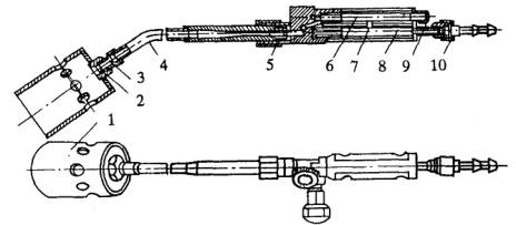 х) По исследованиям ЦНИИПромзданий трещины не обнаружены при температуре минус 50 С. (Измененная редакция. Изм. от 23.10.96 г.) (Измененная редакция, Изм. от 06.11.96 г.) Приложение 3ПЕРЕЧЕНЬ ИСПОЛЬЗОВАННЫХ ИСТОЧНИКОВ1. СНиП 2.05.03-84. Мосты и трубы. 2. СНиП 3.06.04-91. Мосты и трубы. 3. ВСН 32-81. Инструкция по устройству гидроизоляции конструкций мостов и труб на железных, автомобильных и городских дорогах. 4. СНиП 2.01.01-82. Строительная климатология и геофизика. 5. ГОСТ 12730.5-84. Бетоны. Методы определения водонепроницаемости. 6. ГОСТ 10060-87. Бетоны. Методы контроля морозостойкости, 7. ГОСТ 9128-84. Смеси асфальтобетонные дорожные, аэродромные и асфальтобетон. Технические условия. 8. ГОСТ 23279-85. Сетки арматурные сварные для железобетонных конструкций и изделий. Общие технические условия. 9. Руководство по строительству дорожных асфальтобетонных покрытий. М., Трансиздат, 1978 г. 10. Контроль качества на строительстве мостов. Пособие для ИТР мостостроительных организаций. М., «Недра», 1994 г. 11. СНиП 3.06.03-85. Автомобильные дороги. Приложение 4ПРАВИЛА ПОЛЬЗОВАНИЯ ПРОПАНОВЫМИ ГОРЕЛКАМИВоздушно-пропановые нагревательные горелки: однофакельная (ГВПН) и многофакельная (ГВПЛ) предназначены для оплавления рулонных гидроизоляционных материалов при устройстве гидроизоляции. Горелки можно использовать также для удаления наледи и снега с изолируемой поверхности и ее подсушки. Техническая характеристика горелок: ГВПН ГВПЛ производительность при наклейке гидроизоляционного материала, м2/час 60 240 расход пропана, л/м2 0,4-0,6 давление пропана, МПа 0,1-0,15 0,01-0,05 количество факелов, шт. 1 19 длина, мм 630 - масса, кг 1,5 11 Однофакельная воздушно-пропановая нагревательная горелка ГВПН (рис. 1) работает на смеси пропана с воздухом, инжектируемым из атмосферы. Пропан из баллона через редуктор РД.1-БМ или ДПП-1-65 по резиновому шлангу подводится к нипелю горелки под избыточным давлением 0,1-0,15 МПа и далее через регулировочный вентиль газа направляется в трубку наконечника. Многофакельная горелка ГВПЛ (рис. 2) состоит из штуцера для присоединения запальника, запальника, распределительного коллектора, опорных колес, ствола. Пропан из баллона через регулятор давления и резиновый рукав с внутренним диаметром 9 мм подводится к горелке. Основная часть пропана через ствольную трубку направляется в коллектор, в котором равномерно распределяется по форсункам дозирующими вставками нагревательных форсунок. Часть пропана от ствола отводится к запальнику. Рис. 1. Горелка воздушно-пропановая нагревательная (ГВПН): 1 - колпак; 2 - вставка; 3 - штуцер; 4 - наконечник; 5 - инжектор; 6 - воздушная камера; 7 - латунная трубка; 8 - пропановая камера; 9 - заглушка; 10 - штуцер к шлангу Рис. 2. Горелка воздушно-пропановая нагревательная линейная многофакельная (ГВПЛ): 1 - штуцер для присоединения запальника; 2 - ствол; 3 - запальник; 4 - распределительный коллектор; 5 - форсунки; 6 - опорные колеса Допущенные к работе с горелками ГВПН и ГВПЛ лица должны перед началом работы проверить горелки и убедиться в их исправности. При обнаружении утечки газа она должна быть немедленно устранена следующими приемами: в сальнике вентиля - подтягиванием сальниковой гайки или заменой сальникового кольца; в шпинделе вентиля - зачисткой поверхности конуса мягкой наждачной бумагой; в резьбовом соединении стабилизатора горелки ГВПН и дозирующего сопла горелки ГВПЛ - их 