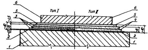 Конструкция одежды ездового полотна с дисперсно-армированной гидроизоляцией (размеры в мм): 1 - выравнивающий слой; 2 - грунтовка из битумной эмульсии; 3 - дисперсно-армированные рубленым стекложгутом слои гидроизоляции; 4 - дисперсно-армированные распушенным асбестом слои гидроизоляции; 5 - покровный (неармированный) слой; 6 - защитный слой Следует учесть, что армированные слои предназначены для выполнения основных гидроизолирующих функций и сохранения сплошности (целостности) гидроизоляции, особенно в условиях ее работы над пульсирующими трещинами защищаемой поверхности бетона. Равномерное распределение отрезков армирующего материала как по толщине, так и по площади наносимого слоя позволяет значительно повысить деформативность гидроизоляции при отрицательных температурах и величину ее удлинения при разрыве. 2.4. Покровный (неармированный) слой из битумной эмульсии, с наполнителем или без него (в зависимости от марки применяемого битума и требований по теплостойкости), наносят с целью закрыть не обработанные битумной эмульсией волокна армирующего материала и выровнять поверхность армированных слоев, а также для самозалечивания в теплый период года трещин в армированных слоях, образовавшихся в критических ситуациях. 2.5. По своим функциональным свойствам (водо-, биостойкости и химической стойкости), трещино-, теплостойкости и т.п. холодная мастичная дисперсно-армированная гидроизоляция на основе битумных эмульсий не уступает традиционно применяемым. 2.6. В зависимости от применяемого волокнистого армирующего материала рекомендуются следующие типы конструкции холодной мастичной дисперсно-армированной гидроизоляции (см. рисунок): I тип - с дисперсным армированием гидроизолирующего состава рубленым стекловолокном с длиной волокон от 10 до 20 мм; II тип - с дисперсным армированием распушенными материалами (асбестом, стеклянной или минеральной ватой) с длиной волокон от 2 до 10 мм. 2.7. При выборе типа конструкции гидроизоляции необходимо учитывать степень ответственности сооружения, район строительства, длину моста, величину продольного уклона, конструкцию пролетного строения. I тип конструкции гидроизоляции следует применять при строительстве малых, средних и больших, мостов и путепроводов а также в составных по длине балках пролетных строений с арматурой, расположенной в закрытых каналах (с двумя армированными слоями) или в открытых каналах (с тремя армированными слоями), а также при строительстве горизонтальных мостов или мостов с малыми продольными уклонами во II климатической зоне. II тип гидроизоляции (с двумя армированными слоями) применяется при строительстве малых, средних и больших мостов и путепроводов, а также в составных по длине балках пролетных строений с арматурой, расположенной в закрытых каналах, при наличии продольного уклона. 2.8. Все сопряжения гидроизоляции с тротуарными блоками, деформационными швами, водоотводными трубками и ограждающими устройствами выполняют также путем напыления компонентов дисперсно-армированной гидроизоляции. Конструкции (схемы) сопряжений аналогичны конструкциям сопряжений гидроизоляций из горячих битумных мастик с армированием прослойками сетчатых материалов. 2.9. В узлах сопряжения температурно-неразрезных пролетных строений дисперсно-армированную гидроизоляци